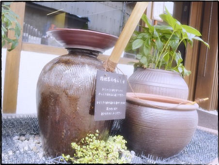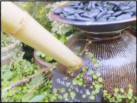 (写真1)軒先にやってくるアート  (写真2)このアートには「使用法」の札も 「路地琴」というのは路地に設置できる据え置き型の水琴窟のことで、特別に細工のされた瓶にひしゃくで水を注ぐと、水滴がまるで琴を奏でるような美しい音をたてるという伝統的な環境音装置とのこと。向島の路地のあちこちにこうした昔ながらの密やかな音響アート装置を設置して、音の散歩を楽しみながら向島の町並みを再発見してほしい、というのがこのプロジェクトの目的だとのことです。