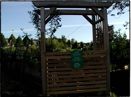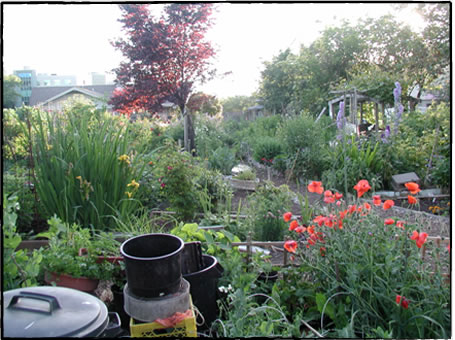 幾つか寄せられた回答の内、公有地と私有地の共同利用の好例として、バンクーバーのメンバーからの回答が、一番楽しそうでした。下の写真は、メンバーの住む近所にある「コミュニティー・ガーデン」です。水をまいたり、何がしかの作業をしている人の姿がよく見られるそうです。