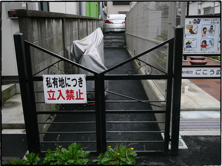 さらに、この公園に向って左側には、通り抜けできない私有地があって、バイクが一台置かれていました。向こう側は駐車場で、車の後部が見えます。駐車場とバイクが置かれているスペースの間には段差があって、歩いて通り抜けるのも難しそうですが、そもそも手前に柵があるので、入れません。もし右側のミニ公園に柵が無くて、バイク・自転車の通り抜け自由なら、サイズ的にはちょうど良い駐輪場になっていたかもしれません。