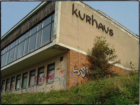 [今では廃墟となっている旧東ドイツ時代の温泉所。看板の文字が何故かバウハウス風]