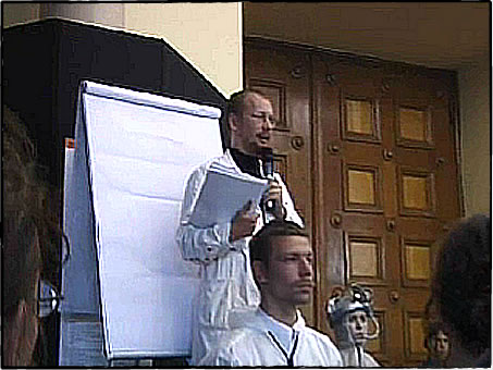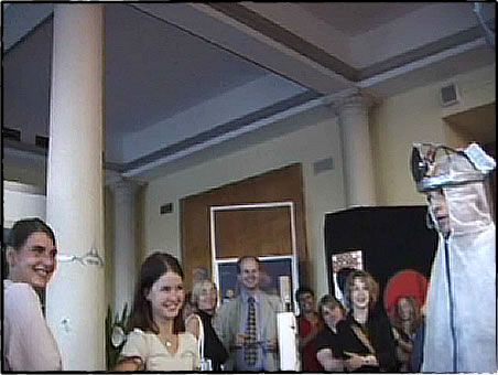 観客をパフォーマンスの内側にスムーズに誘うためには、まずこのパフォーマンスの世界が「アート」という枠組みによって護られた安全で自由な遊びの場であることを観客が了解する必要がある。伝達方法はいろいろとあるだろうが、LSPでは「ここはライカ犬の宇宙旅行をシミュレートする実験室です。これから皆さんにライカと、ライカと一緒に旅をしたノミになって、この架空の宇宙空間を旅して、ライカとノミの五感を体験してもらいます」といったストレートな情報を、しょっぱなに観客に明かしてしまうことにした。こうすることによって、観客はこのパフォーマンスの性格と、その中での自分の役割をダイレクトに把握することができ、不必要な不安を抱かずに済んだのである。