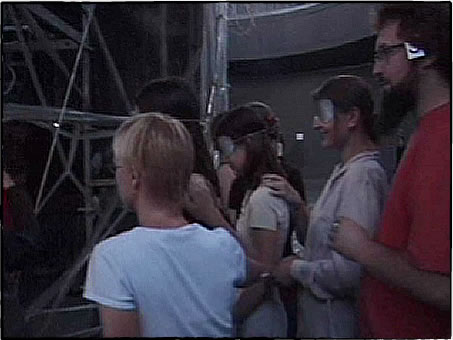ここで重要なのは、観客がお互いに協力し合わなければ、どうにも動きのとれないような状況が故意に作り出されているという点だ。このデザインされた依存関係の故に、その場で出会ったばかりの観客同士が、恥ずかしかろうと、面倒臭かろうと、なんとかコミュニケーションを取りながら協力し合い、次第に信頼関係を結び、共同作業としてパフォーマンスを体験していくことになるわけだ。