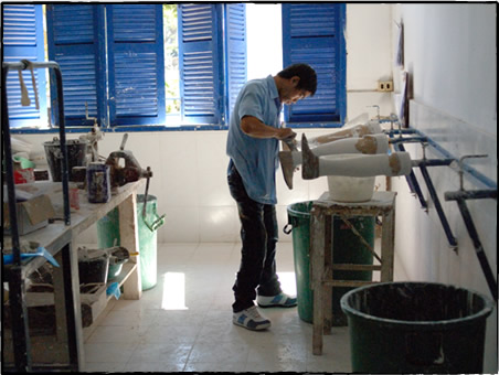センターの隣の建物では、実際に義手・義足を作っていた。見学してよいものか少し迷ったが「サバイディー」と声をかけ、入ってもよいかとたずねると、中で作業していた40歳くらいのラオス人の男性が、快くOKしてくれた。手や足の型を石膏で取り、その上にプラスチックをかぶせて固めたあと、石膏を取り除いて完成する。数人の若者が一心不乱に義足を作成していた。ここでは、義手・義足の取り付け後のリハビリまで行う。