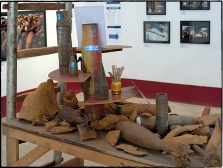 ビジターセンターは、ビエンチャン最大の市場『タラート・サオ』に近い、比較的人や車で賑わう通りにある、白い壁の二階建ての倉庫のような建物である。訪れてみると、展示物や写真が示す悲惨な現実に圧倒される。クラスター爆弾が空中で割れ、中から小型の爆弾が無数に振ってくる様が表現されている。その小型の爆弾が不発に終わり、今になって爆発して被害者を出しているのだ。その奥には鉄くず回収業者が集めた爆弾の数々が並べられ、被害者の写真や義手・義足も展示してある。