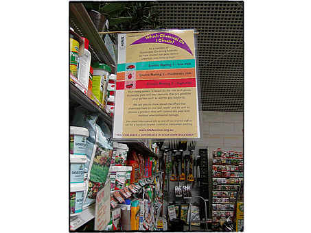ガーデニングの持続可能性 メルボルン近郊にある大型ホームセンターは休日ともなるといつも多くの人で賑わう。屋内のガーデニングコーナーは3列ほどあり、そのうちの1列には、何を選べば良いのか迷ってしまうほど様々な種類の除草剤、害虫駆除剤、用途別肥料が所狭しと並んでいる。 美しいバラの花や青々とした芝生のイメージ写真と効果を高らかに謳ったキャッチコピーからは、それがどれほど環境に害があるものかは全く伝わって来ず、買い物客が気軽に手に取ってカゴに入れている。商品の危険性や環境負荷度を認識せずに農薬や化学肥料に安易に手を出してしまう一般客は少なくない。 一方、私のお気に入りである近所のガーデンセンターでは、各商品の環境負荷度が一目見てわかるような表示を行っている。商品棚でまず目につくのが各商品の前に貼られている3色のカラーラベルだ。「サステナブル・ガーデニング・オーストラリア協会(SGA)」というNGO団体が、各商品に含有されている化学物質に応じて環境リスクを評価したもので、青ラベルが低リスク、黄ラベルが中リスク、赤ラベルが高リスクとなっている。