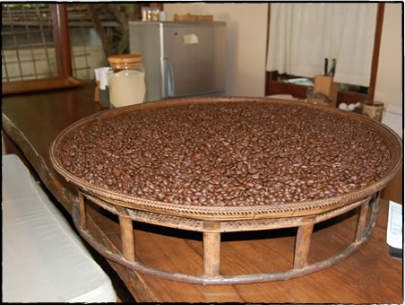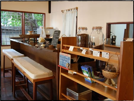 コーヒー豆の買い付けは、基本的には年に一回だけとのこと。今年で3年目なので、まだ買付の回数も3回ほど。コーヒーや茶の産地として有名なパクソーンに足を延ばし、農家に出向いて、直接顔を合わせ、豆を買い付ける。農家の手で果肉を除去した、パーチメントと呼ばれる状態の豆を仲買人の家庭に運び、そこでいったん保存してもらい、必要に応じて脱穀してビエンチャンの店に運んで、そこで選別、焙煎をして店に出している。このパーチメントの状態で買い取るのが、農家にとっても松島さんにとっても、都合がよいという。農家にとっては手間が省けるし、松島さんにとっては、品質管理が容易になる。