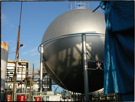 艀(ハシケ)が工場裏の水路まで運び、工場のパイプに接続してオイルを入れる。中央下の白いパイプ。