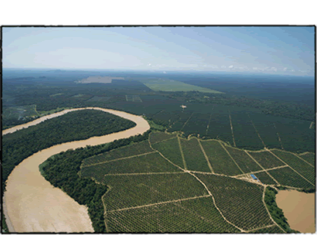 下キナバタンガンのモノカルチャー(単一の農作物の生産)による景観の分断。河畔林がなく、何箇所かでヤシがキナバタンガン川に向かって一帯に植えられている。(写真:ノビスタ)