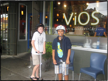いつも “アイスコーヒー” エスプレッソをベースにしたコーヒー飲料で一躍有名になったシアトルは、まさしくカフェ天国。筆者も以前は、足しげくカフェに通ったものだったが、子供が出来て事態が一転。オムツ・着替えなどの荷物を抱えて一苦労。「公共の場で子供が大泣きしたらどうしよう」の気苦労で二苦労……。そうこうしているうちに、すっかりカフェから足が遠のいてしまった。 「家飲みでも、おいしいコーヒーなら気が済むかも?」そう思ってコーヒーの銘柄を変えたりもしたが、子供の世話に気を取られて一息つく時には、いつも冷え切ったコーヒーになっていた。それにカフェの喧騒や、知らない人ばかりなのに空間を共有して繋がっている感じは、家ではどうにも得られない。 親子カフェ、デビュー シアトルでは自宅・仕事場に次ぐ第3の居場所として、カフェの存在が広く受け入られている。子供用の絵本や遊び道具も日常的に用意されているので、マナーさえわきまえていれば、子供連れでもあまり引け目は感じない。むしろ子供も客として、くつろぎの場を提供されている印象を受ける。「受け入れ態勢が出てきている」というような。 しかし子供の年齢が上がってくると、静かに座っていることが難しくなる。そんな時、シアトル在住の先輩ママが、親子カフェ兼ギリシャ料理レストランVios Café and Marketplace(以下Vios)を教えてくれた。 並木道が続く閑静な住宅街の一角にあり、自然光がたくさん入る大きな窓ガラスが目印。入口から右手にはアイスクリームやマリネ、ハマスなどを売るデリがあり、惣菜を買って帰るだけでも便利そう。ナチュラル志向のインテリアもおしゃれで、「本当に子供OKなの?」と疑いつつ店の奥へ視線を動かすと「えっ?」。店のほぼ1/4、たたみ6畳分はゆうにあるキッズエリアが併設されていたのだ。