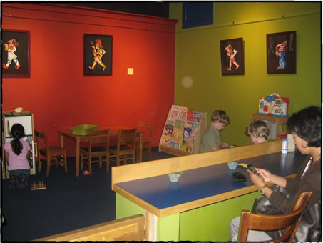 ブロック遊び用のテーブル、おもちゃのパントリーにキッチンセット、絵本に積み木に機関車、と遊び道具が揃うなか、3~4歳の男の子が手で車を押しながら、カーペットの上を動き回っている。その反対側では、幼稚園児と小学生ぐらいの姉妹が、忙しそうに冷蔵庫とパントリーの掃除をしている。親たちは、その脇にあるカウンター席でおしゃべりしたり、スマートフォンでメールをチェックしたりしている。 低い壁で囲まれているので、子供がどこかに行ってしまう心配がない上、遊び道具もスペースも充実。利用しない手はないじゃない! Viosらしくあるための場所 「近くに学校があって、周りは住宅街。家族連れが歩いてやってくるのにぴったりなの」と店のロケーションを説明する店長のDezさん。キッズエリアは2004年のオープン時以来のものだ。オーナーのトーマスさんは、2002年に夫人を亡くして以降、しばらくレストラン業から離れていたが、小さな男の子を育てながら開店にこぎつけたというから、このスペースは、必要あってのものだったのかもしれない。