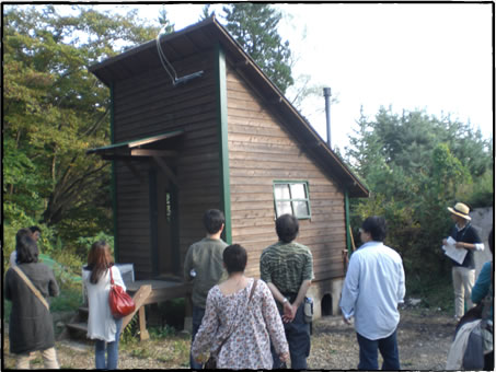 非電化籾殻ハウス。断熱性に優れているので、夏は温度の低い床下の空気を取り入れ、冬は、ダルマストーブでちょっとあたためるだけで、冷暖房はOKということでした。