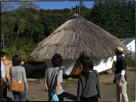 確かに外見はすてきです。三角パネル組立方式の、頑丈でシンプルなつくりは、みんなの視線をくぎ付けにしました。屋根はススキで葺かれ、てっぺんには風車で回る非電化天窓換気扇。 中に入ってみると、床面積は10平方メートルですが、案外広く感じました。