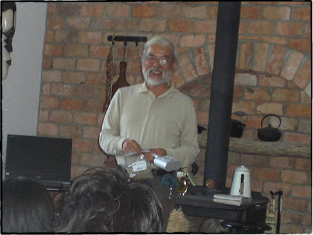 母屋に戻って、みんなに、非電化コーヒー焙煎機で煎ったコーヒーやはと麦茶、そして手作りのクッキーがふるまわれました。やさしい笑みを浮かべて、藤村さんが、静かに語り始めます。 藤村さんのお話は、どれも元気の出る、夢のあるお話ばかりでした。