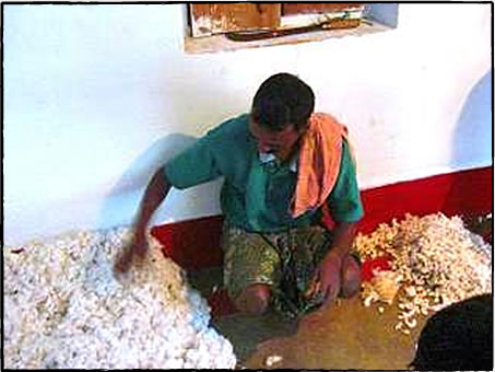 コットンの等級分けをするビラム氏(左がA 級、右がC 級)