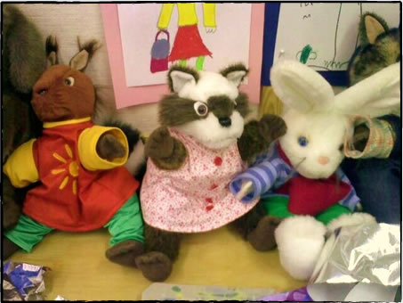 教科書の登場人物のパペット達。これを右手に、左手に教科書を持って、子ども達は人形劇をしながら会話文を読む練習をする。