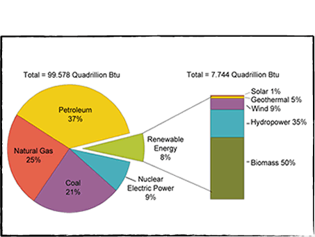 アメリカでの再生エネルギー利用 ![]() アメリカのエネルギー供給/消費量統計(2009年のデータ、Geology.comより) 石油37%、天然ガス25%、石炭21%、原子力9%、再生エネルギー8% 再生エネルギーの詳細は、バイオマス50%、水力 35%、風力9%、地熱5%、太陽熱1%
