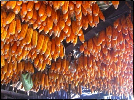 Marthang村への家路に向かう村人たち  Marthang村への家路に向かう村人たち  屋根裏に吊るされた保存用トウモロコシ