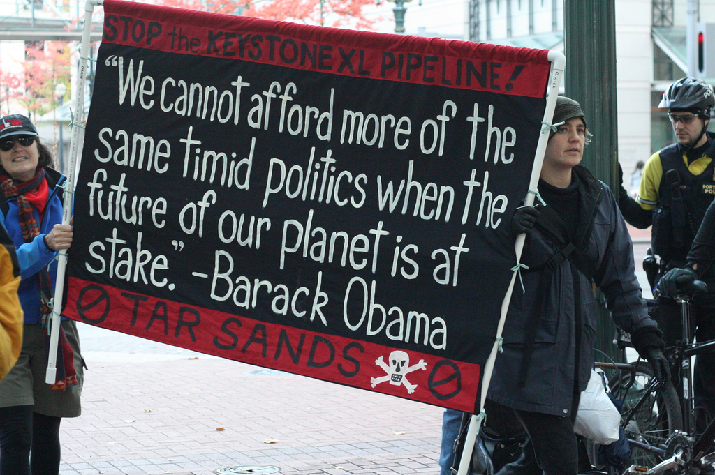 ポートランドでの反対運動支持者が掲げたバナー。オバマ大統領自身の発言である「我々の地球の未来がかかっている時、今までのような弱気な政治を続けている余裕はない」を用いている。