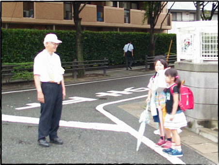 一緒に公民館役員をしていた知り合いに頼んで、子どもが見ても良くわかる名刺を作り小学校の校長室に持参。登校途中の子どもたちに配ることを校長に許可されると、毎朝自宅近くの交差点に立って、「おはよう!」という挨拶とともにその名刺を配り始めた。