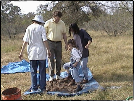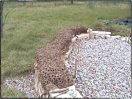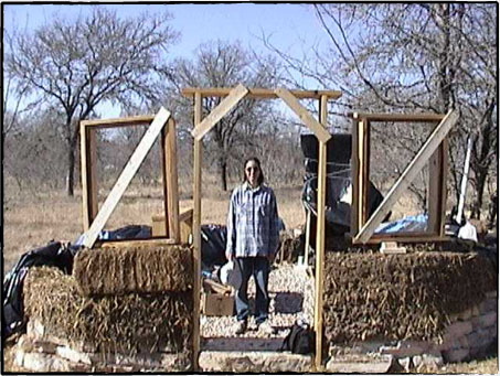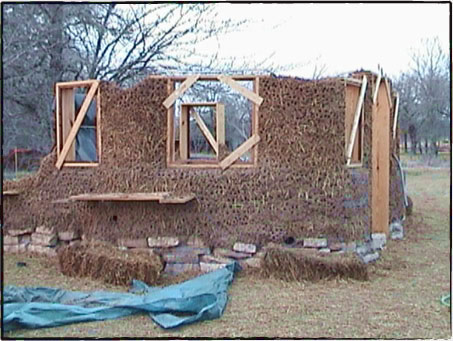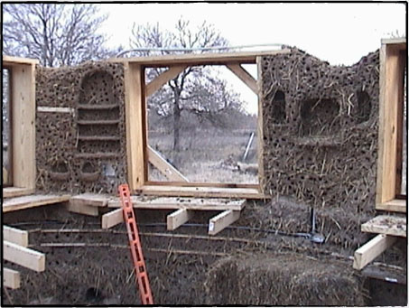 2001年11月、テキサス州がようやく涼しくなってきた頃、我々はようやく壁作りを開始しました。 コブで壁をつくる作業は前年のワークショップでみっちりやってきたことだったので、土台作りのように新しいことを手探りで学ぶわけでもないし、我々もワークショップを開催して人を呼び共同作業で早く進められるだろうと考えていました。 うちの土地がコブに理想的だった点の一つは、主材料の一つである粘土が現地からとれることでした。 地面を30センチほど掘り下げると、表面ではさらさらしていた土が固くなり、粘土層に達したことがすぐにわかります。 それで土台を掘るときに採れた粘土を集めて、壁作りに使うよう準備していました。 砂は近辺の工事材料を販売している業者から調達しましたが、藁を見つけるのは難儀でした。