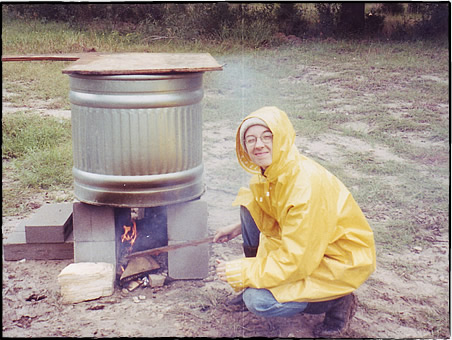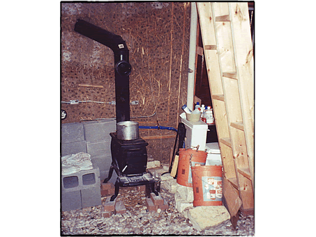 [急遽買ってきた鉄製の暖炉] 水道は、じきにつながりましたが、湯沸かし器がないので(アメリカで一般に使われているのは大型のタンクに水をためてガスか電気で暖めておくという古典的なスタイルなので、小さな我が家には置き場所がない)お風呂にも入れません。 もちろん太陽で水を暖めるのはこの季節では不可能ですから、今度はこれまた家畜用の鉄の水桶を買ってきてレンガの上に置き、水を入れて下に薪で火を焚きました。 土でできている家の中で不用意にこんな大量な水を扱えませんから、屋外でです。