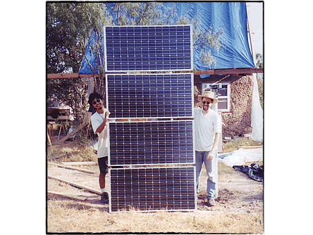 [友人とソーラーパネルを組み立てているところ] 2002年夏、建築を始めてから1年たちましたが、コブの小屋は完成には、まだまだ遠い状態でした。 この時点で完成していたのは土台と壁の大半(といっても土の表面はむき出し、上の方は未完成で屋根付近は穴だらけ)、そして屋根の枠組みだけでした。 が、土地のローンを返済しながら家賃を払うのも予算的にもう限界。 我々はできかけの家への引越しを強行することにしました。 片道40分ドライブして作業に通うのも大変でしたし、しばらくはキャンプ的な生活になっても、土地に住んでしまえば作業もはかどると考えたのです。