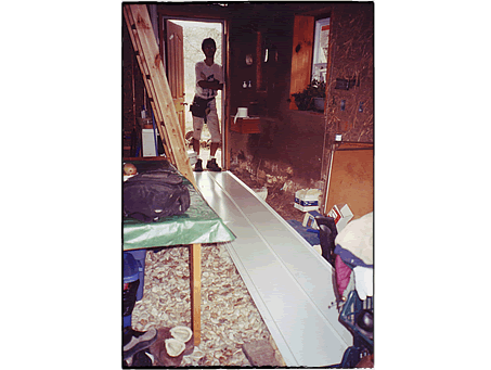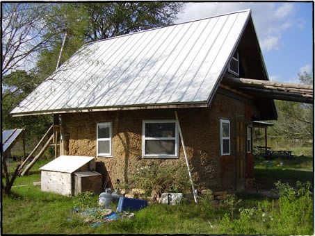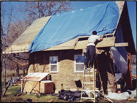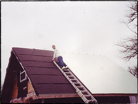 2003年に入り、できかけの家に引っ越してから6ヵ月以上たちましたが、電気、水道、トイレ、暖房など、何もない状態から始めたので、まず必要最低限のものを確保しなければならず、建物そのものには関与しない作業が続きました。 ようやくチャンスが訪れたのはその年の春休み、2月半ばでした。 妻の学校が一週間春休みになるのを利用して屋根をつけようというプランでしたが、最初の2、3日間の後はまた雨が降るという予報でした。 取り付けの途中で降られると塗装されてない部分に水分がつき、屋根が錆びてしまうということなので、大急ぎで作業をしなければなりませんでした。 屋根の設置といっても物理的には難しいプロセスではありません。 金属の長い板を端から順番に専用のネジで屋根の上に設置していくのです。 金属とはいっても薄い板ですから手を切らないように気をつけながら2人で屋根の上へ押し上げ、一番上を締め金で留めておいて角度を修正し、一つ一つネジを入れていきます。 難しかったのは、うちの屋根は角度が45度近く、立つことが危険だったということ。 長い梯子を使っての作業でしたが屋根をこすって塗装を剥がしてはいけませんから非常に神経を使いました。 最初の2日間の後は雨が降るらしいということなので早朝から日暮れまで休まずに延々と作業した結果、2日目の夕方遅く、ついに屋根は雨に降られてもいい状態にまでできあがりました。 何ヶ月も雨漏りに悩まされたり作業が遅れたりと気苦労の根源だった屋根がついに完成した時には妻と2人で嬉し泣きしたものでした。 建築を開始してから2年近く。 屋根が完成したことにより、我が家も外側から見るとようやく一人前の家らしい風貌になりました。(つづく)