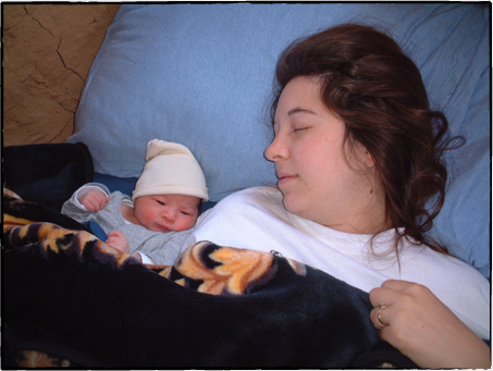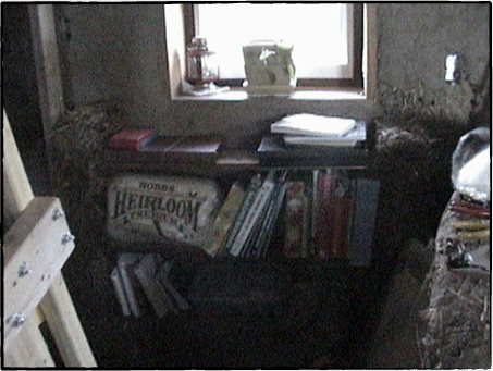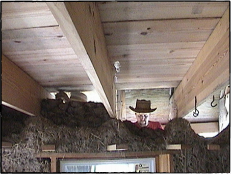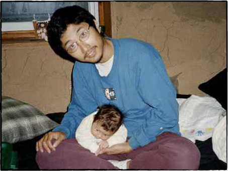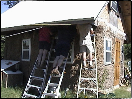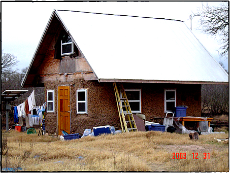 2003年春、ちょうど屋根がついたのと同じ時期に妻、Terriが妊娠しました。 壁も上の方は、梯子に登っての作業になりますから、仕事の速度はのろくなります。 上へ行くほど壁も薄くして良い(下部ほど重みを支える必要がない)のですが、何事でも仕上げの作業は、その段階に到達するまでの作業と比べて非常に時間がかかります。 何度かワークショップを開催して人を集め、仕事をはかどらせようとしましたが相変わらず助けになる人は集まらず、ほぼ自分たちでやらなければなりませんでした。 ベンチの下にはスペースを開けておいて収納庫としても使えるようにしました。 このベンチ最大の特徴は、妻がベッドとしても使えるようデザインしたことです。 我々が前年寝泊りしていたキャンピング・カーからアイデアを借りました。 普段はこのベンチの形に合わせて木材を切って作ったテーブルを使うのですが、テーブルの足を取り外しできるようにし、板をベンチの真ん中に並べることによりベッドになるようにしたのです。 秋には壁も塗りました。 塗る材料は、粘土と砂に水と糊を混ぜただけの自然からとれるものだけです。 安価で安全なので誰にでもできますが、コツがないわけでもありません。 一回一回手で材料をくみ取って投げつけるように壁につけ、その後で手や平たい道具(しゃもじが大好評でした)で表面を平らにします。内壁は3回塗るのですが、一回ごとに砂をより細かくサラサラなものにし、表面が滑らかでスムースになるようにしました。 そうしているうちにあっという間に月日はたち、、12月半ばに妻は元気な女の子を出産しました。 助産婦さんを頼んで自宅でお産しましたが、産まれたのは上記のベンチ兼ベッドの上でした。 生活環境は改善されつつありましたが、まだ床は砂利状態、お湯も一々沸かさなければないという状態でした。 しかし、無事にお産の終わってホッとしたその直後、恐ろしいことがおこります。 生まれてちょうど一週間後、僕の不注意から火事をひき起こしてしまいました。 手伝いにきていた母と2人で買い物にでかけている途中、電話で妻から報せを受け、慌てて帰りましたが、通りから見えた巨大な煙の柱の光景は今でも目に焼きついています。