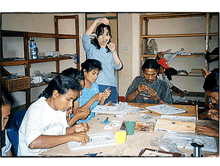 カウンターパートが見つからなくて、しばらく停滞したのですが、そのころ1999年に選挙監視員で現地に行っていた女性に出会い、彼女がUNICEFの現地組織《エスペランサ》代表のアガピト氏を紹介してくれました。彼女から、調査に行くから一緒に行こうと言われて、まだ早いのではと思ったのですが、ご縁も感じ、とりあえず行ってみようかと。それが2回目で、2002年8月でした。彼女が、先に現地入りして、ラジオや口コミでワーカーを募集してくれたのですが、その結果60人も応募があったのです。募集の条件は「目が見えて、多少器用で、字が読めること、長時間イスに座っていられる人」それだけでした。先に面接までしてくれていて、当初は10人の予定だったのが15人になっていました。